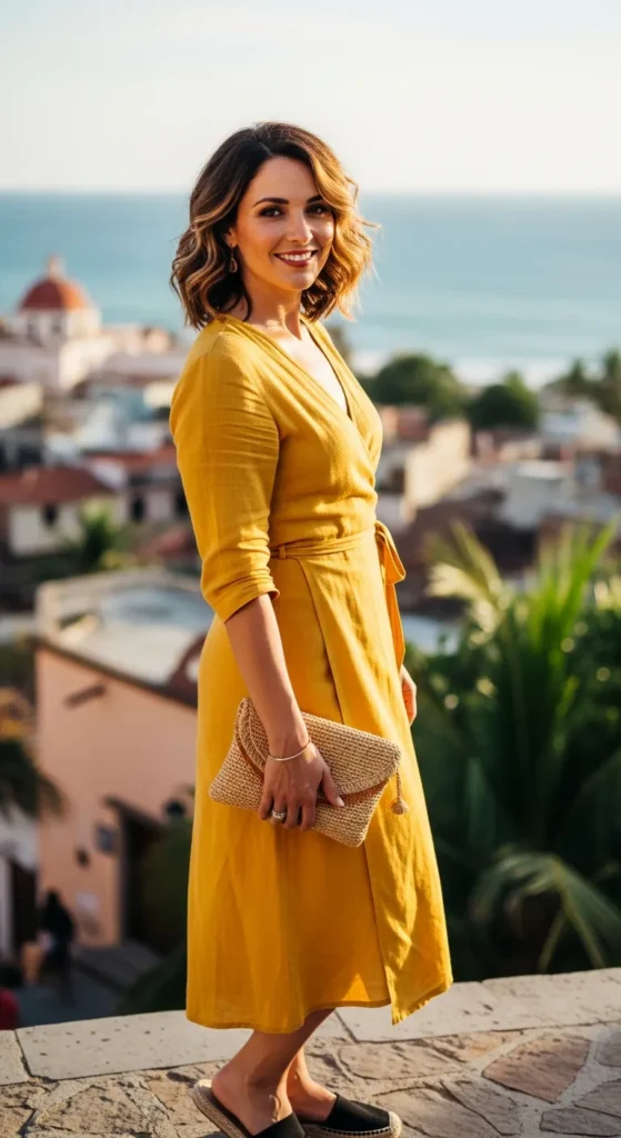 A mango yellow wrap dress instantly brightens your look while offering a flattering silhouette. It’s easy to wear and perfect for both daytime exploring and casual dinners onboard.