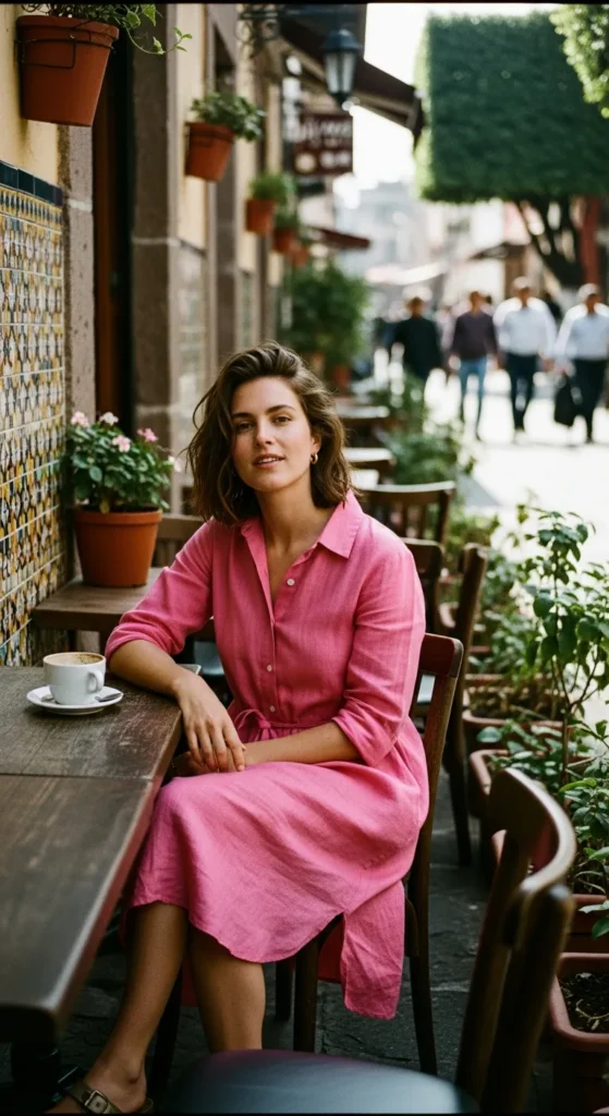 A relaxed pink shirt dress offers comfort and style in one easy piece, perfect for sightseeing or grabbing a casual lunch.