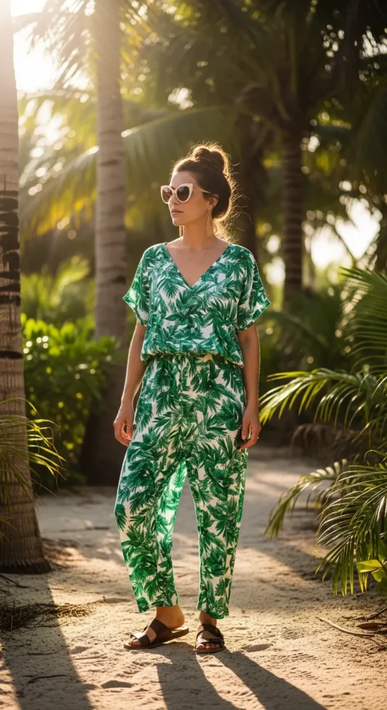A palm-print jumpsuit captures the tropical spirit effortlessly. It’s stylish yet practical, letting you move freely while still looking put-together for excursions or deck photos.