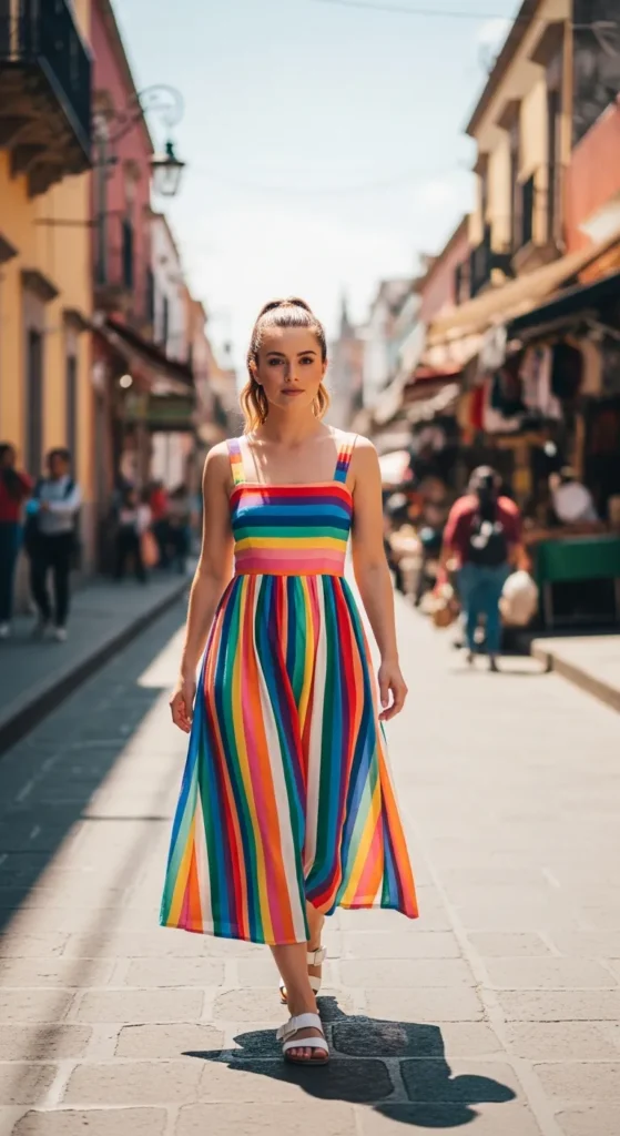 Stylist Suggestion: Keep accessories neutral; simple white sandals and a plain bag help the colorful stripes stand out without visual clutter.