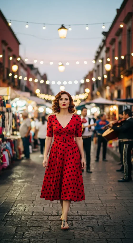 A red polka dot dress brings retro charm with a vibrant twist, perfect for photo moments and evening strolls.