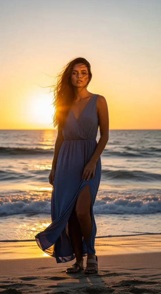A soft blue maxi dress with a slit combines elegance and ease, ideal for breezy evenings by the ocean.