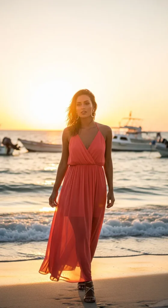 Stylist Suggestion: Add gold hoop earrings and strappy sandals; the metallic accents enhance the warmth of coral tones while keeping the look light and vacation-ready without overpowering the softness of the dress.