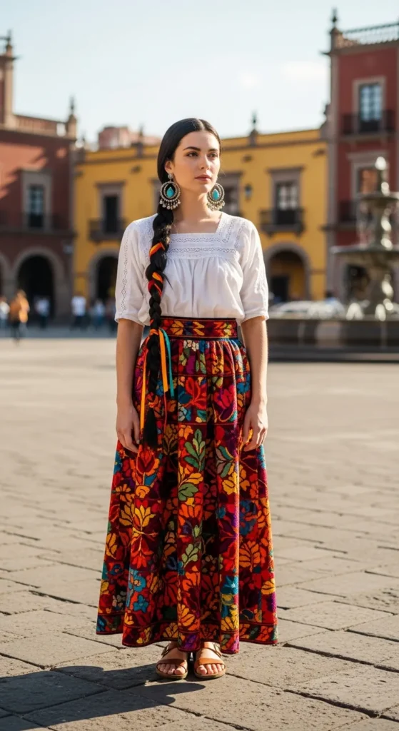 A crisp white top paired with a colorful embroidered skirt reflects Mexican artistry while keeping your look breathable and effortlessly chic.