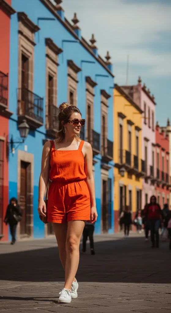 A bright orange romper feels energetic and carefree, perfect for sightseeing days filled with sunshine.