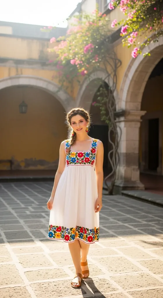 A crisp white sundress with colorful floral embroidery nods to traditional craftsmanship while staying modern. It feels light, breathable, and photogenic in every setting.