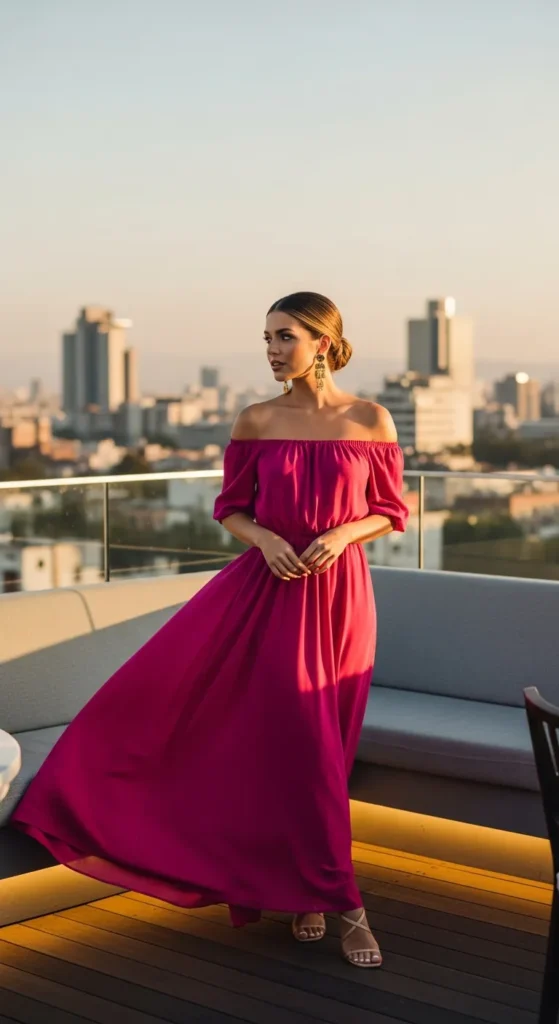 This vibrant fuchsia maxi with an off-shoulder neckline feels romantic yet bold. The airy fabric flows dramatically against colorful tiled streets, perfect for dinner nights and rooftop cocktails.