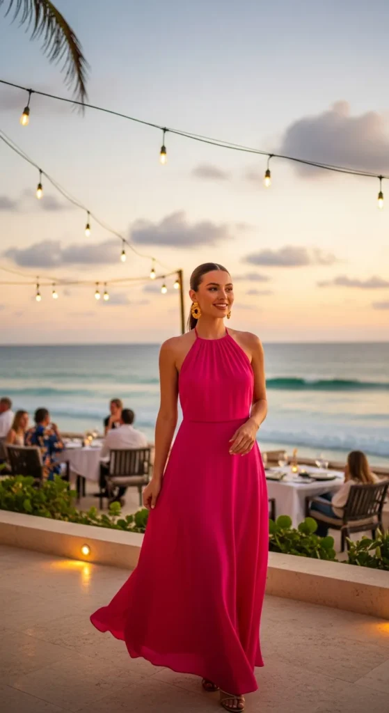 A hot pink halter maxi dress feels bold, confident, and unforgettable, perfect for sunset dinners by the sea.