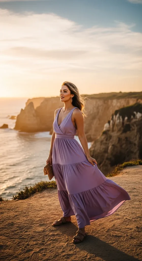 A tiered lavender maxi floats beautifully in the ocean breeze, offering soft femininity against vivid tropical backdrops.