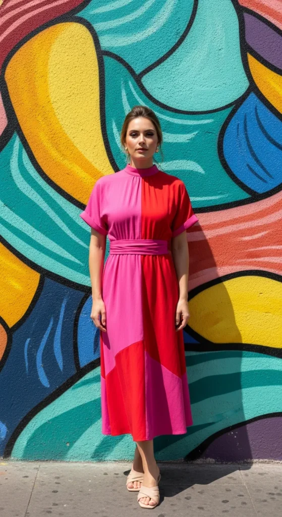 A pink and red color-block midi dress feels bold and artistic, echoing vibrant Mexican street murals.