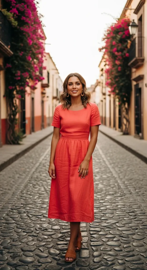 A coral linen midi dress captures the warmth of a Mexican sunset while keeping you cool and breathable. The relaxed waist and soft structure feel effortless for strolling colorful colonial streets at golden hour.