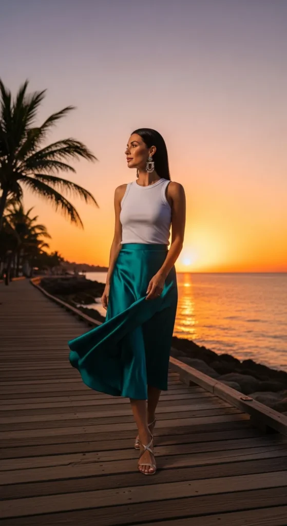 A teal satin skirt styled with a crisp white tank creates effortless balance. The sheen of satin elevates a simple silhouette for evening strolls.
