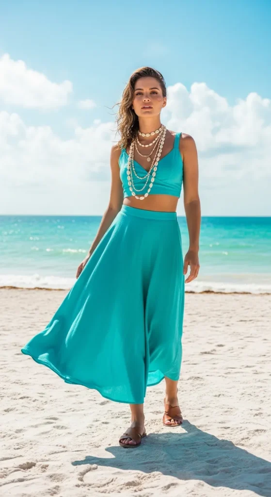 A flowy turquoise crop top and matching high-waisted skirt mirror the Caribbean water near Tulum. Light cotton fabric moves beautifully in the ocean breeze while keeping you cool and playful.