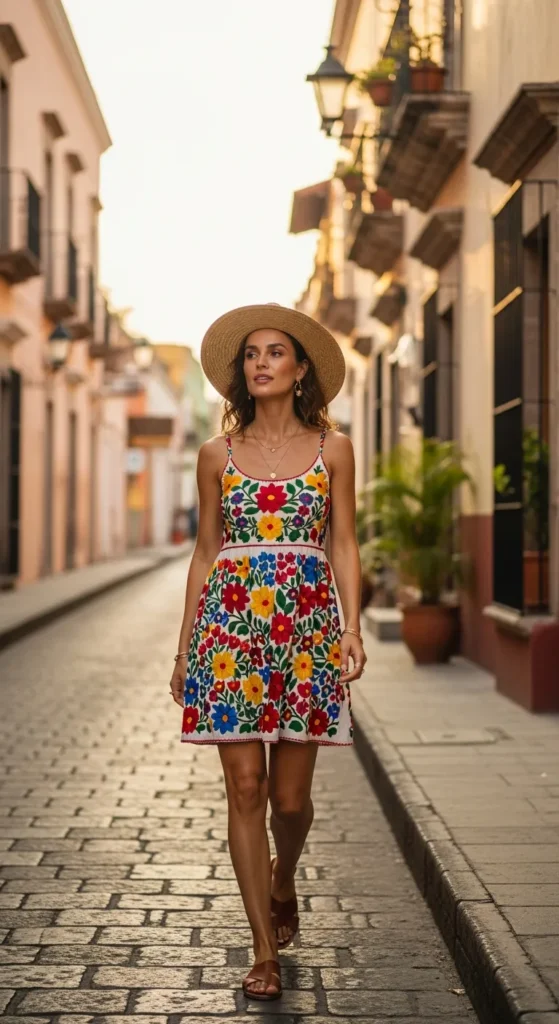 A breezy embroidered sundress instantly feels at home in Mexico, moving beautifully in the heat while celebrating local artistry. Bright threadwork against soft fabric creates a cheerful, relaxed vacation mood without feeling overdone.