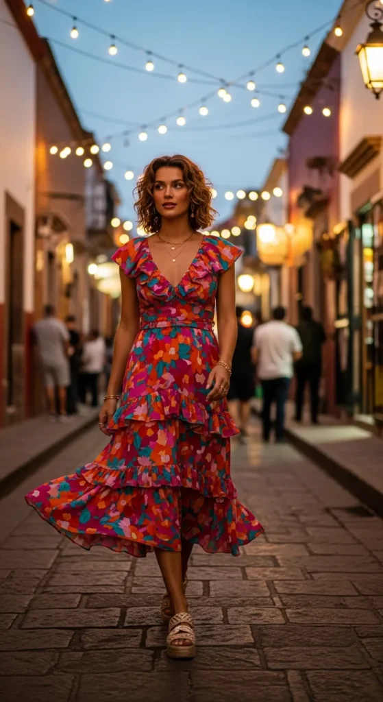 A ruffled midi dress in a bold hue feels joyful and flattering. The movement of the fabric catches the breeze, making it ideal for warm evenings filled with music and street lights.