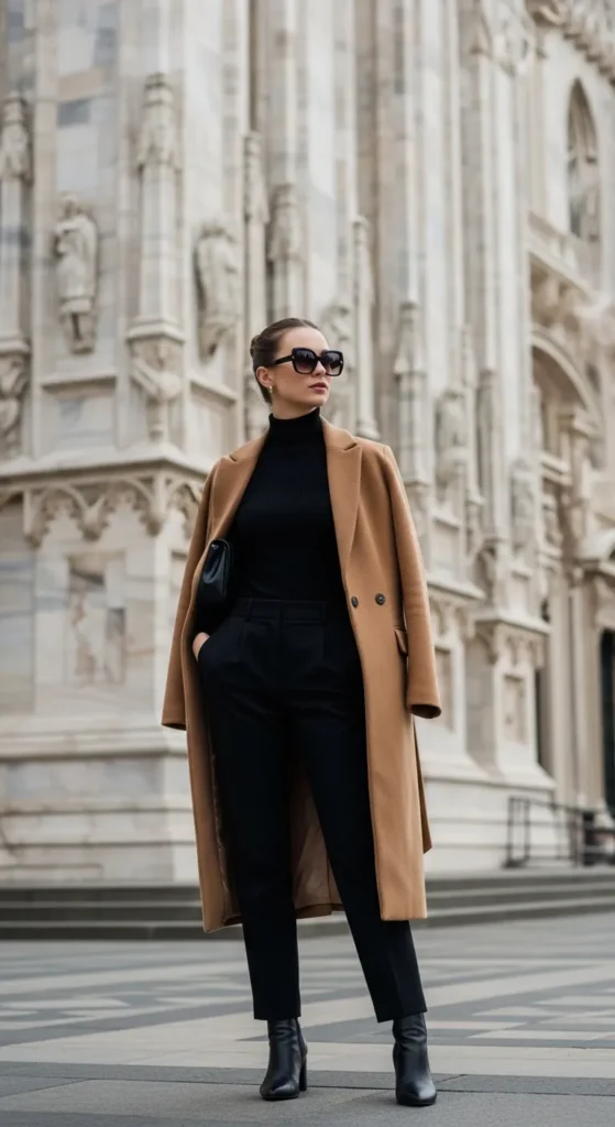 An all-black outfit layered with a camel coat is pure Milan sophistication.