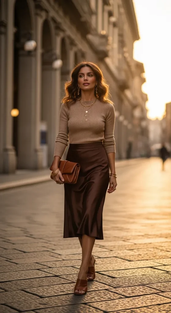 A rich chocolate satin midi skirt with a fitted knit top feels warm and luxurious. The movement of satin catches Milan’s golden light beautifully.