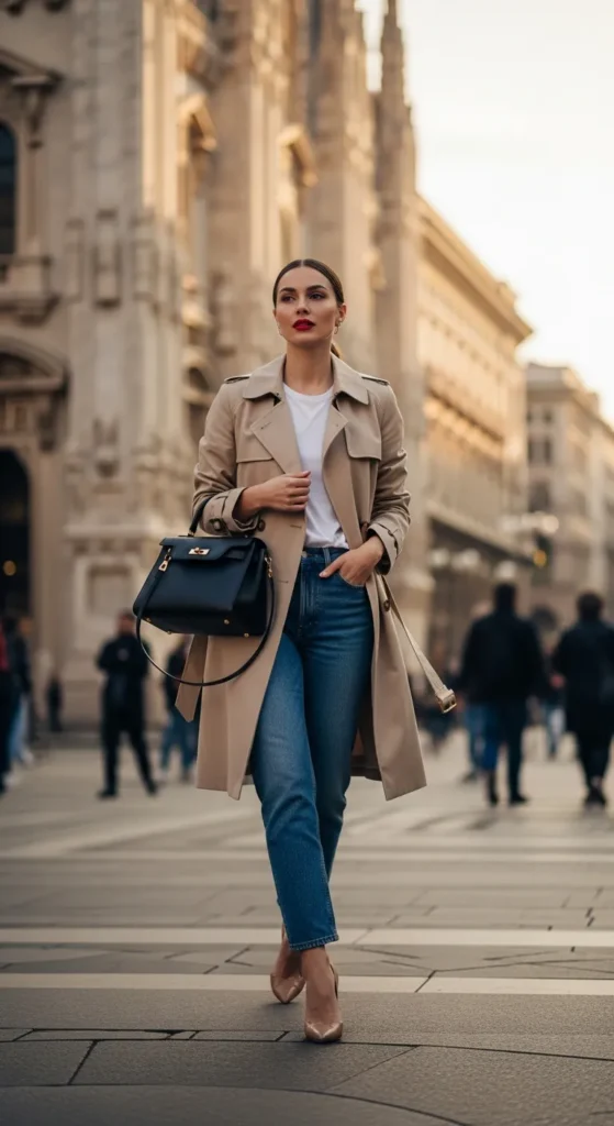 A timeless trench coat layered over straight denim and heels embodies Milan’s effortless confidence.