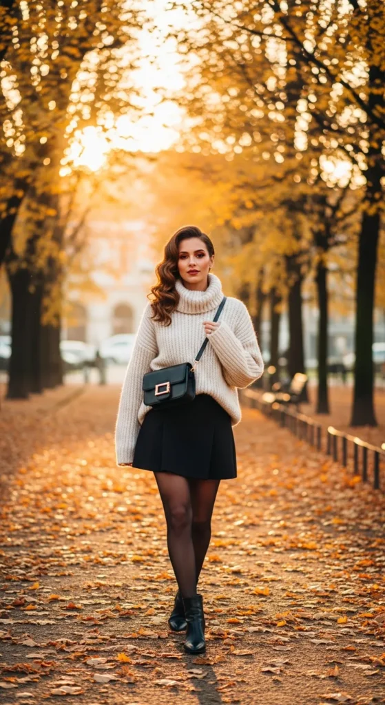 An oversized knit sweater tucked into a structured mini skirt balances comfort and chic.