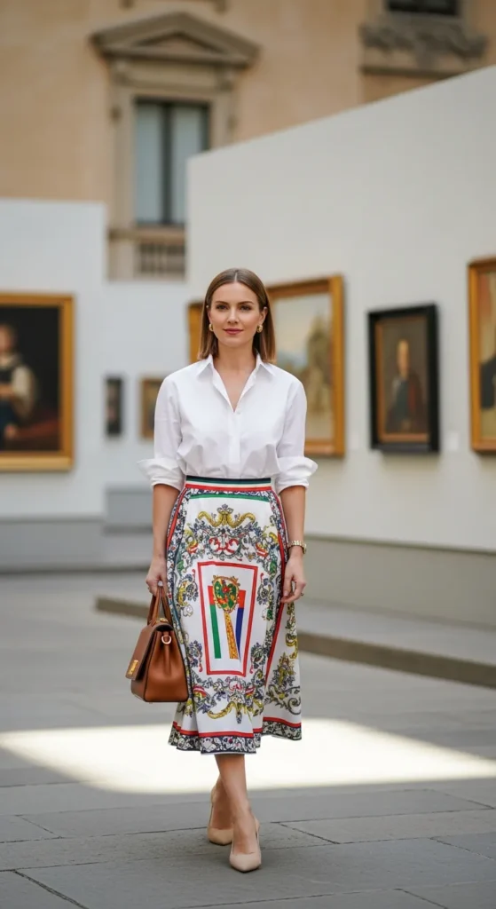 A crisp white poplin shirt tucked into a printed midi skirt feels timeless yet expressive.