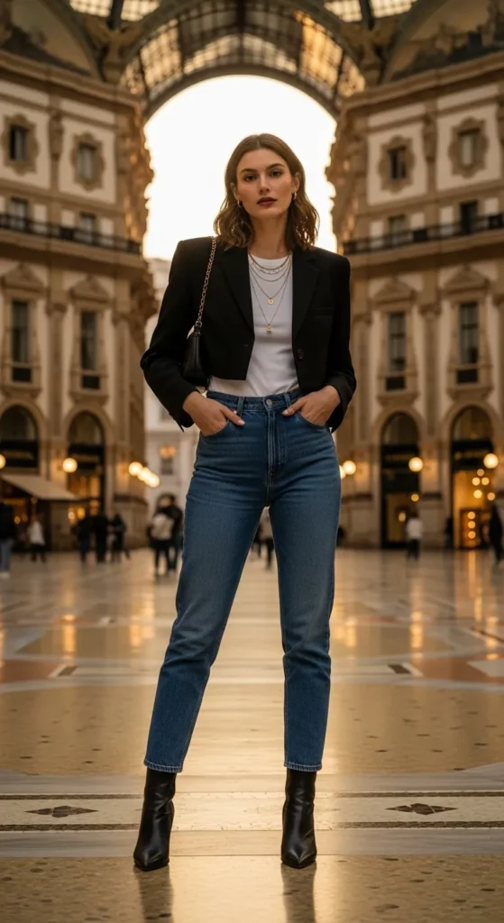 Blend high and low by styling a cropped tailored blazer with straight-leg mid-wash denim. It’s playful yet refined, perfect for museum hopping and café breaks.