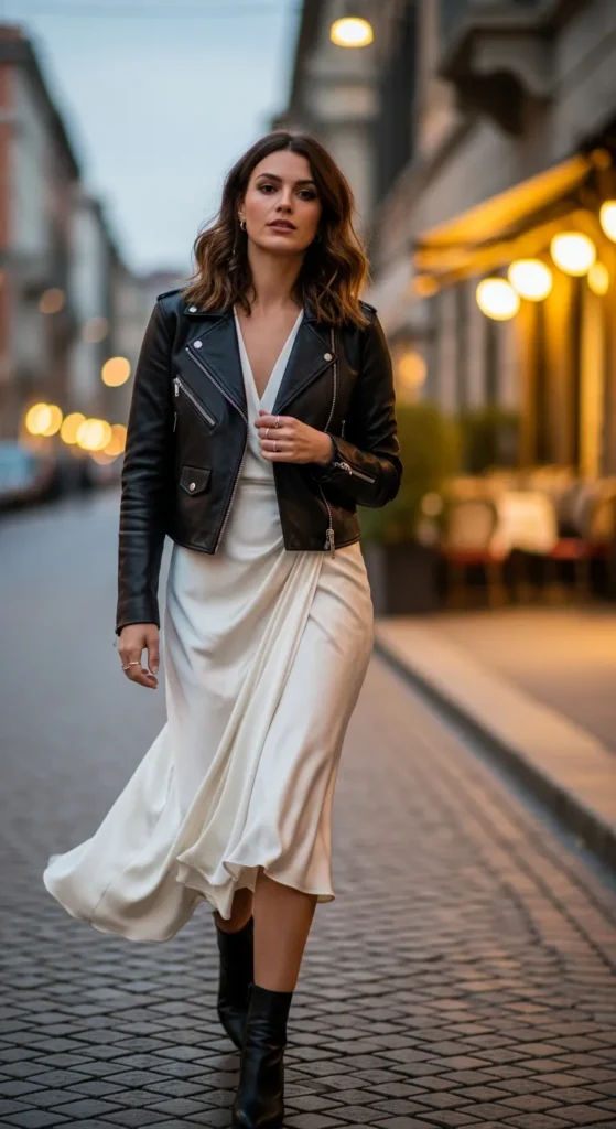 A flowing silk midi dress layered with a cropped leather jacket balances softness and edge.