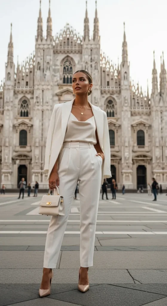 Layering ivory tones, silk camisole, high-waisted trousers, lightweight blazer, creates a dreamy monochrome moment. Milan loves cohesion, and this look whispers sophistication rather than shouting for attention.