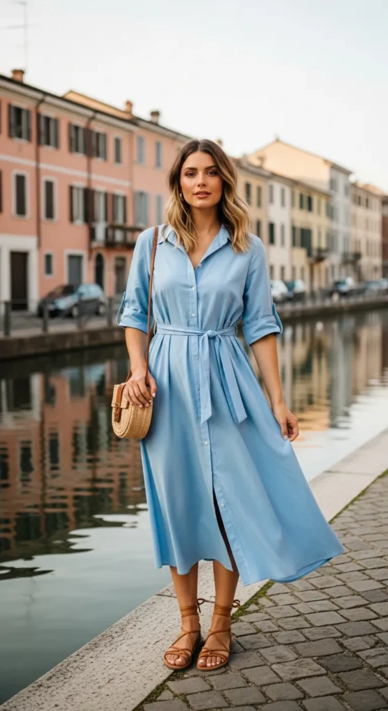 A breezy sky-blue midi shirt dress feels romantic against Milan’s canals. The gentle movement of fabric creates effortless elegance while keeping you cool during summer afternoons by the water.