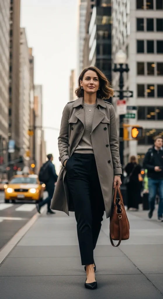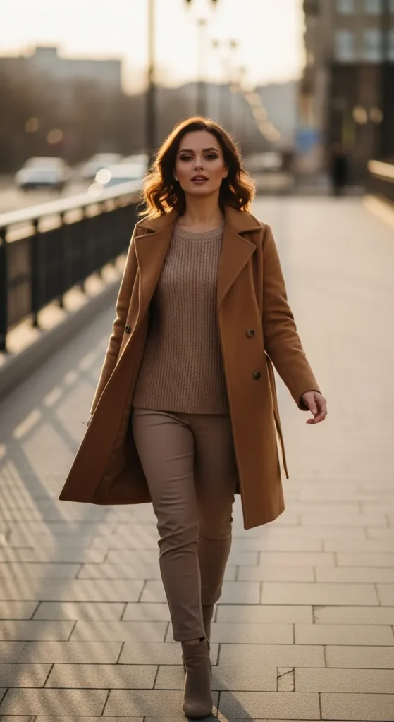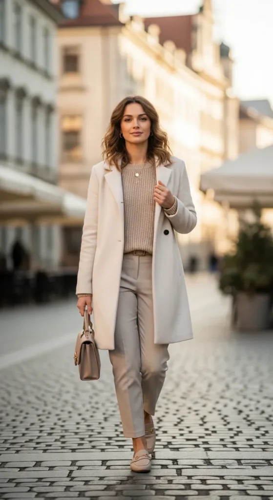 A neutral coat paired with softly tailored pieces feels elegant and wearable. The outfit moves easily between casual and refined settings.
