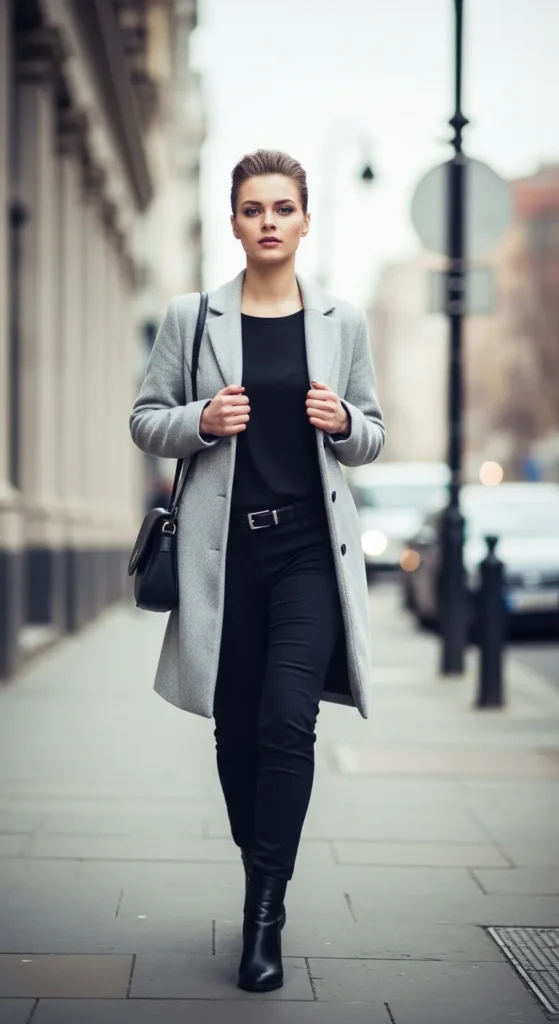 A light grey coat over an all-black base creates contrast without noise. The look feels intentional, modern, and quietly striking for everyday winter wear.