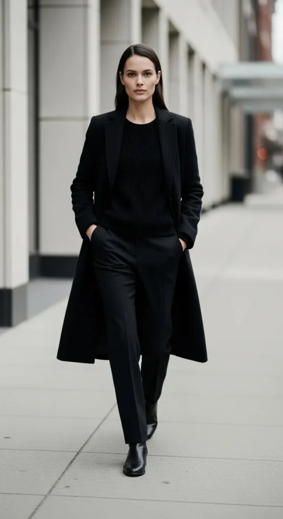 A long black coat layered over simple basics creates a powerful yet quiet winter statement. This outfit feels confident, timeless, and put-together without trying too hard, ideal for everyday city life.