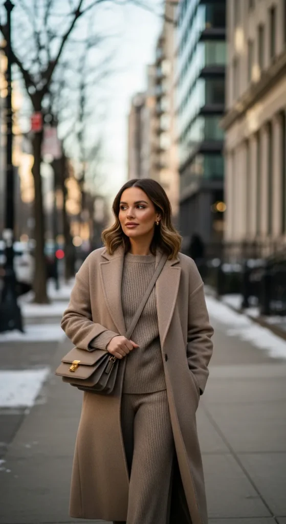A long coat over a matching knit set creates an effortless winter uniform. It feels cozy, modern, and quietly luxurious while remaining easy to wear.