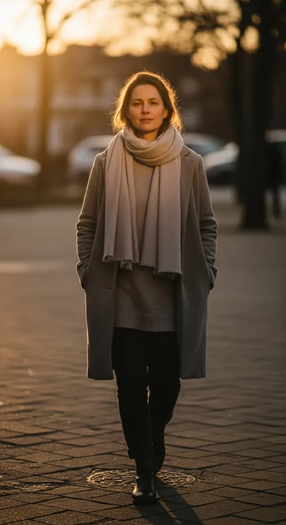 A simple coat paired with a soft scarf adds warmth without disrupting minimal style. The look feels approachable, calm, and thoughtfully layered.