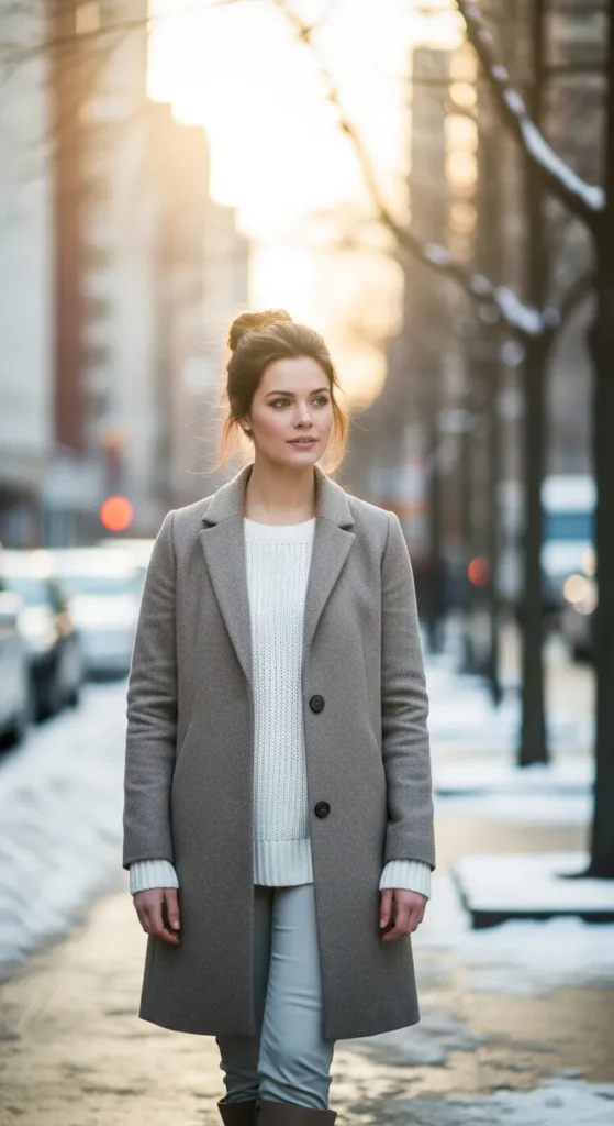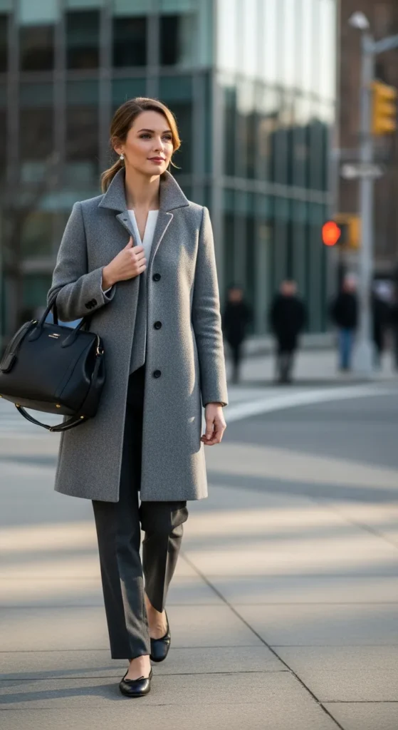 A tailored grey coat paired with straight-leg pants creates a clean, confident winter outfit. It feels structured yet relaxed, perfect for women who love understated elegance with everyday comfort.