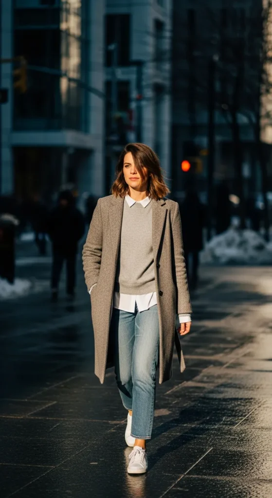 A clean winter coat styled with white sneakers feels fresh and modern. This outfit blends comfort and polish, perfect for busy winter days.