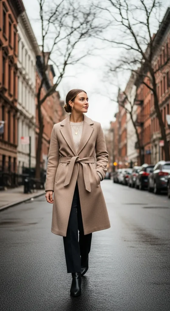 A softly structured belted coat in warm neutral tones creates an instantly polished winter outfit. It feels calm, intentional, and elegant, perfect for women who love effortless sophistication without looking overstyled.