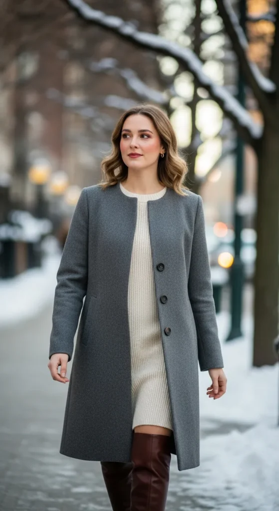 A straight-cut coat layered over a simple knit dress creates a graceful winter look. It feels easy, feminine, and perfectly balanced for casual outings or quiet evenings.