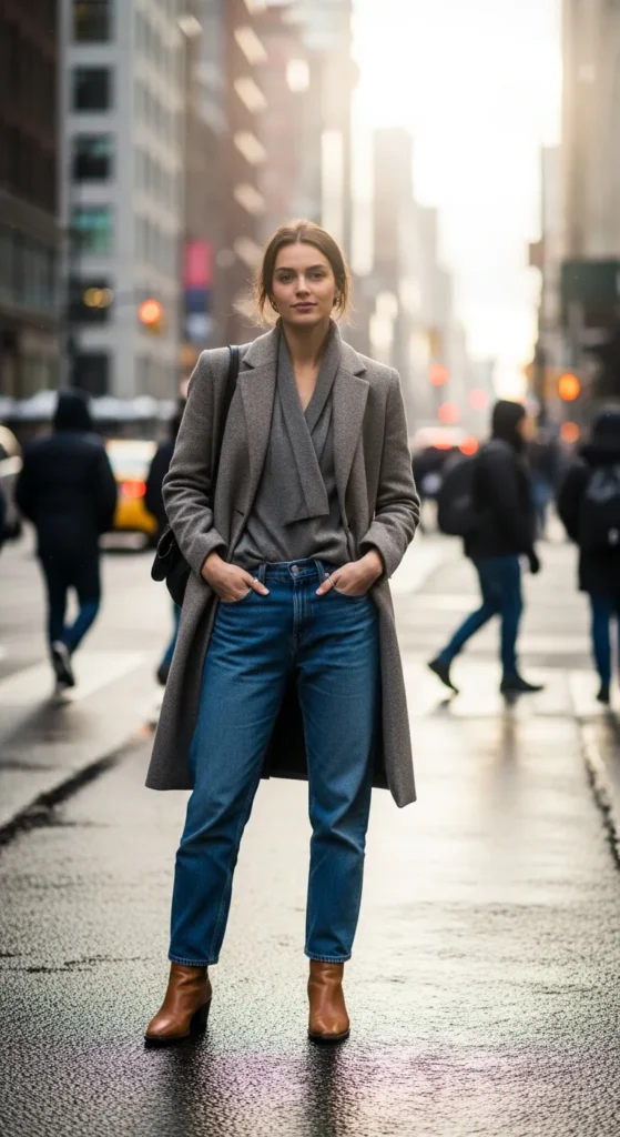 Pairing a structured winter coat with relaxed denim creates a modern balance between polish and ease. The outfit feels real, wearable, and effortlessly stylish for everyday winter moments.