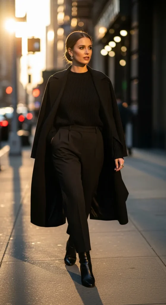This all-black outfit mixes a relaxed black knit top with structured black trousers and a long coat. It feels powerful yet comfortable, perfect for days when you want confidence without sacrificing warmth or movement.