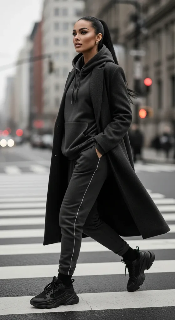 Stylist Suggestion: Finish with chunky charcoal sneakers and a crossbody bag. The sporty elements balance the coat’s structure, making the outfit feel cool instead of overly polished.