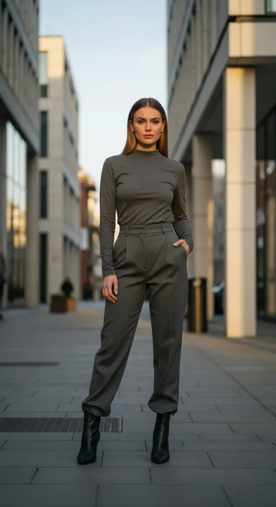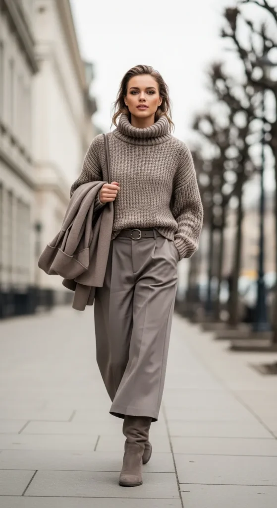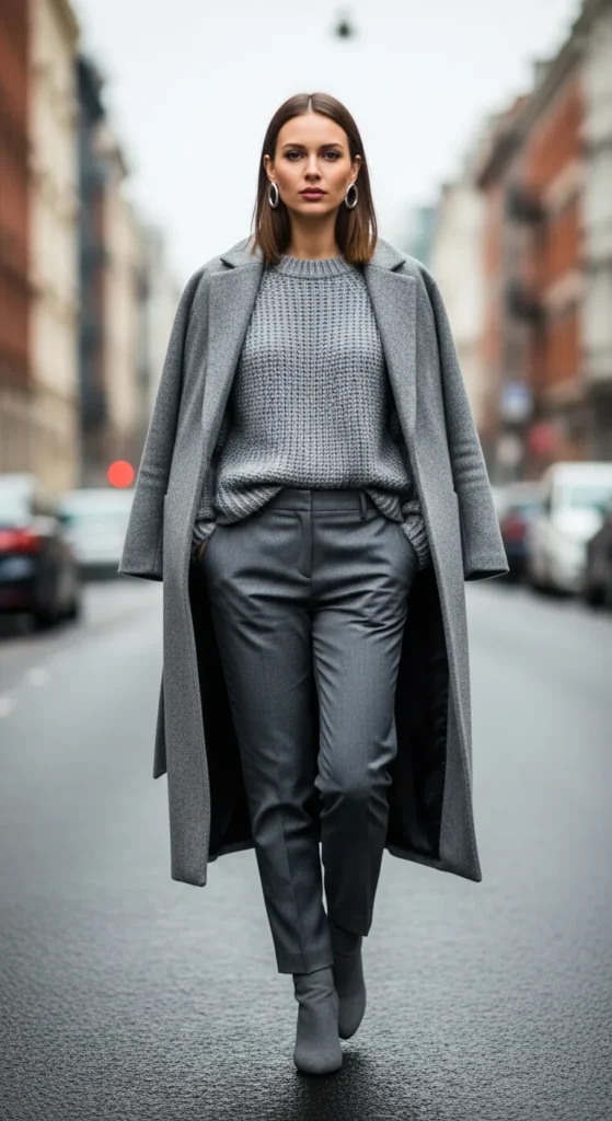A cozy grey sweater layered over tailored grey trousers creates a calm, pulled-together winter vibe. Different knit and fabric textures keep the outfit interesting while still feeling effortless and wearable for everyday city life.