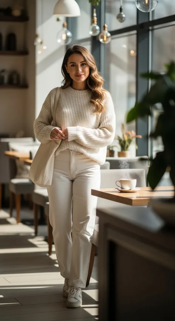 Stylist Suggestion: Add nude-toned sneakers and a matching cream tote. Keeping accessories light maintains the softness of the outfit and prevents the look from feeling too formal or stiff.
