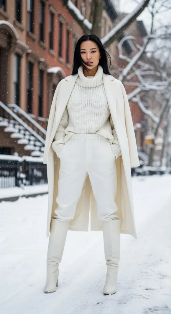 An all-white winter outfit feels clean and confident. Layering a white sweater with white pants and a white coat creates a bold yet calm statement that stands out beautifully against winter surroundings.