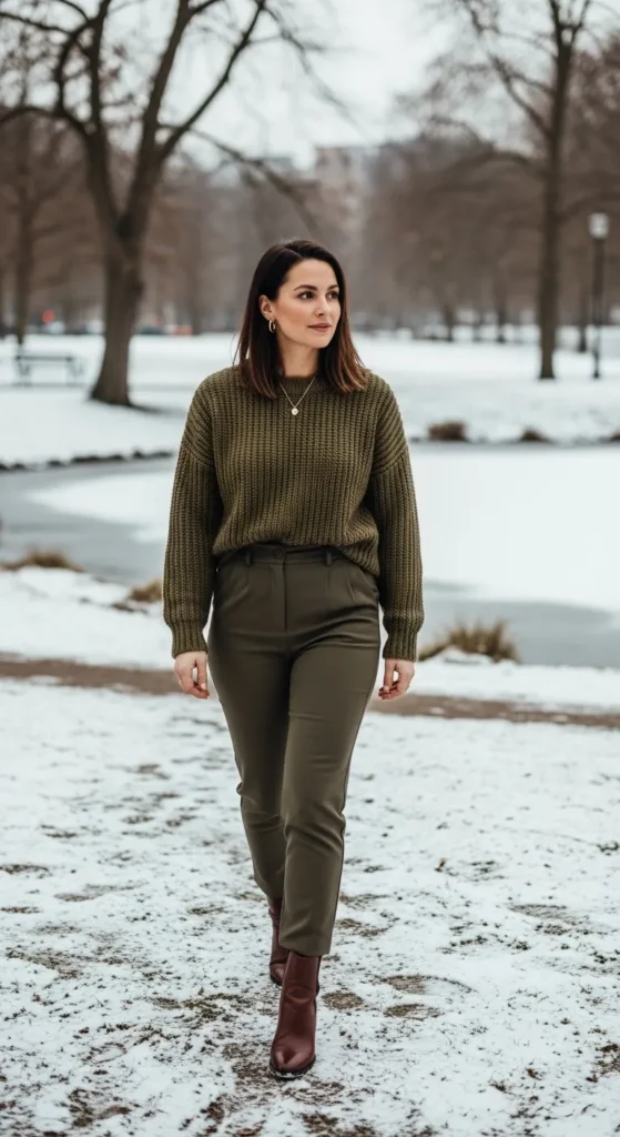 Olive green works beautifully as a winter neutral. An olive sweater with matching pants feels earthy, calm, and modern, offering a refreshing alternative to classic greys and blacks.