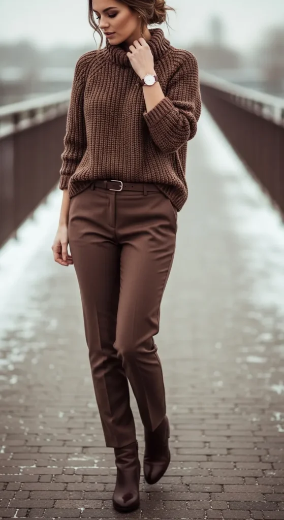 Chocolate brown feels rich and comforting in winter. A deep brown sweater paired with matching trousers creates a grounded, stylish outfit that feels warm, confident, and effortlessly modern.