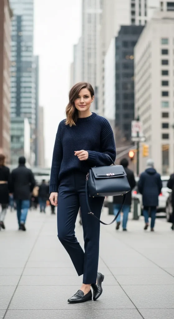 Navy monochrome feels polished and dependable. A navy sweater paired with matching trousers creates a refined winter outfit that feels professional yet relaxed enough for daily wear.