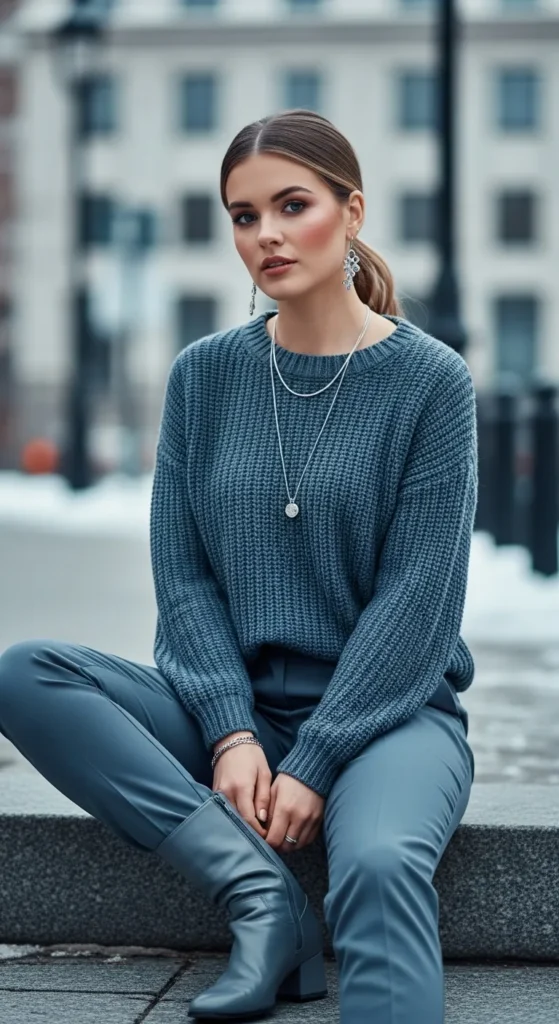 Slate blue brings calm sophistication to winter outfits. A slate blue knit top with matching pants feels modern, relaxed, and slightly unexpected while still being incredibly wearable.
