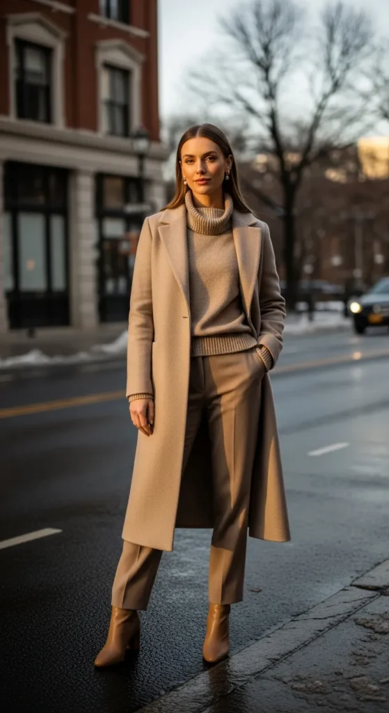Beige tones create a soft, inviting winter outfit. A beige turtleneck paired with matching trousers and a wool coat feels timeless, warm, and easy to wear while still looking refined and modern.