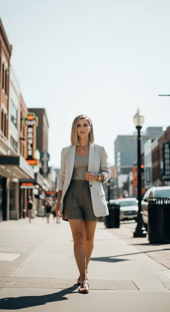 A lightweight blazer paired with shorts creates a smart-casual look that feels polished without being heavy.