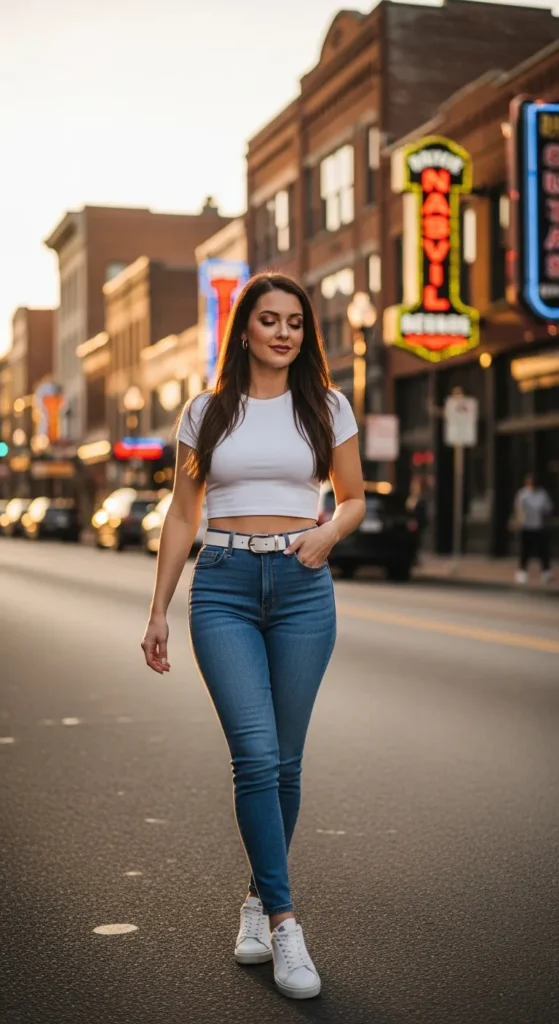 A fitted crop top with high-waisted jeans creates a clean, flattering silhouette. It’s simple but impactful, perfect for casual outings or evening plans when styled right.